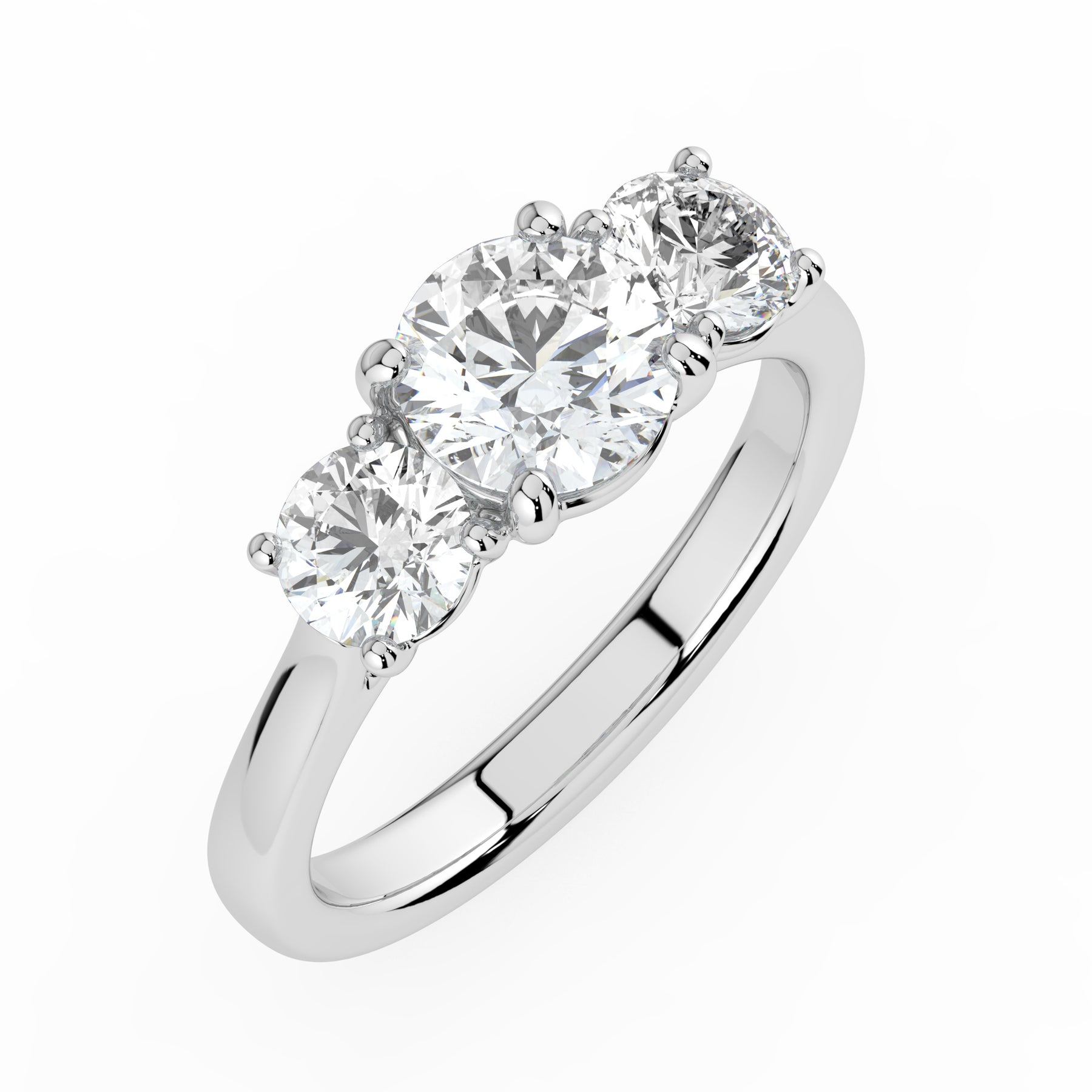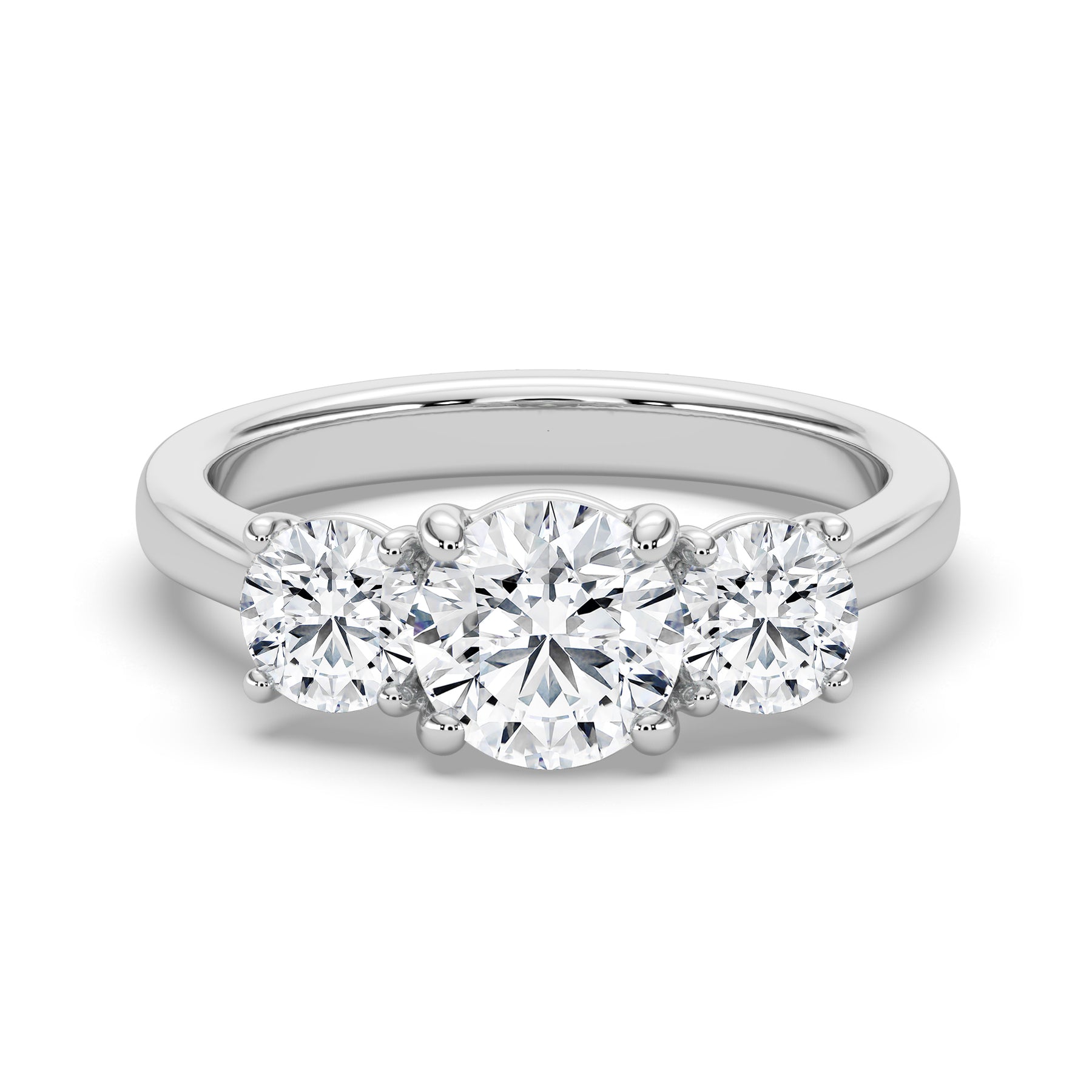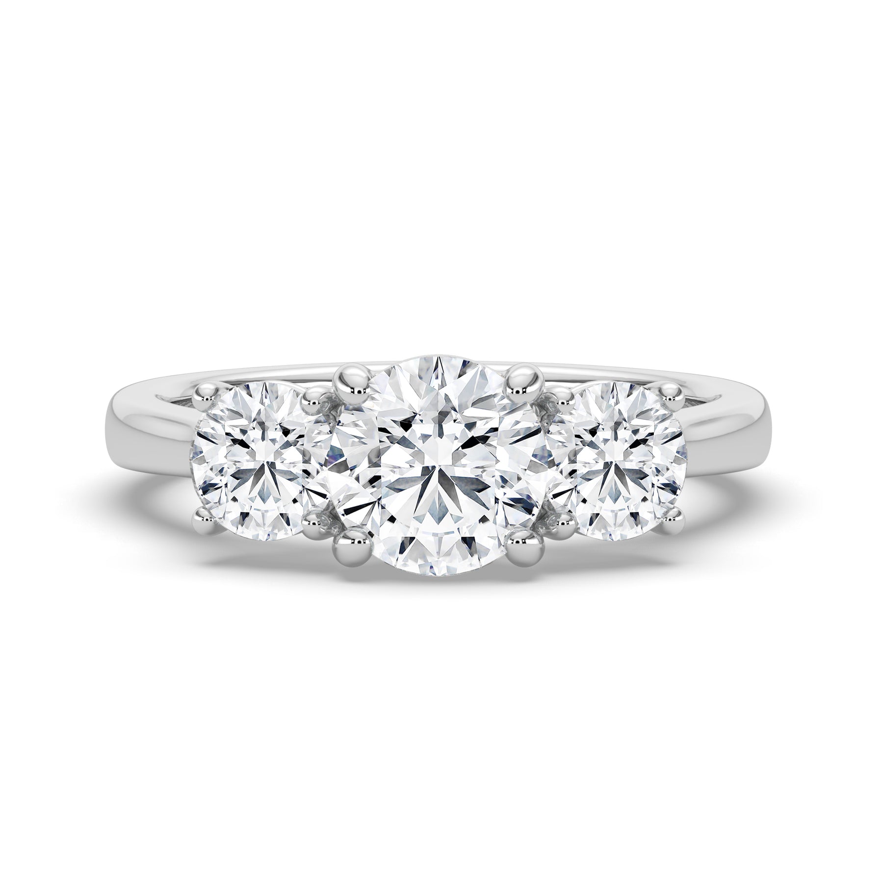 This classic three-stone engagement ring features three round brilliant cut diamonds, symbolizing the past, present, and future of your relationship. Expertly crafted to showcase each diamond’s brilliance, the design balances timeless elegance with meaningful symbolism. Its refined setting enhances the sparkle while providing a comfortable wear, making it an enduring choice for those seeking tradition with sophisticated style.